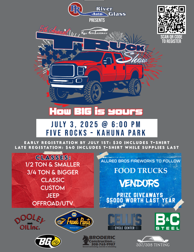 Get ready for the 5th Annual Valley Auto Truck Show, proudly presented by Platte River Glass! It will be an exciting day filled with classic trucks, offroad, and custom builds, all coming together in one incredible showcase. Whether you’re a car enthusiast, a proud vehicle owner, or just looking for a fun community event, this is a show you won’t want to miss. Stay tuned for more details, including event updates and registration information—coming soon!